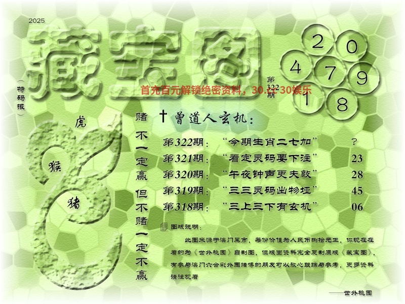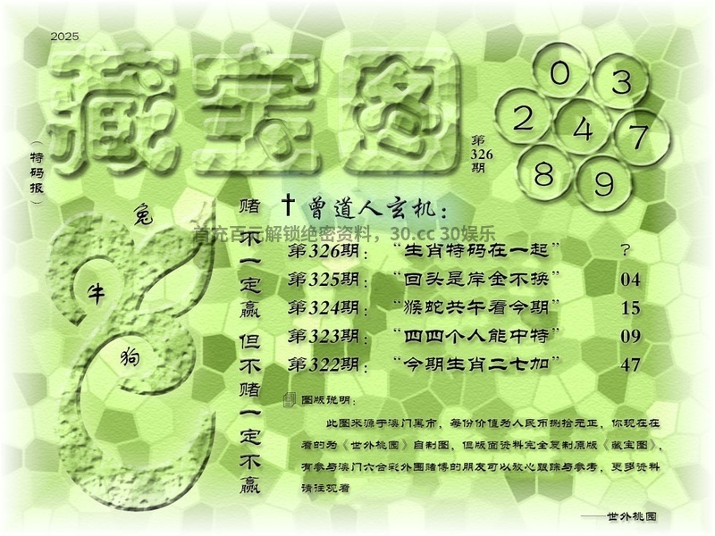 326期藏宝图曾道人玄机:生肖特码在一起 解:生肖特码在一起,解合子生肖龙蛇猴鸡狗猪 解特肖:龙蛇猴鸡狗猪马 |